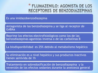 Las benzodiazepinas son medicamentos ampliamente utilizados con propiedades ansiolíticas, hipnóticas y sedantes. Han sido usados desde la década de 1960 y actúan como agonistas de los receptores GABAA en el sistema nervioso central. Se absorben rápidamente por vía oral y se distribuyen ampliamente en el cuerpo, cruzando la barrera placentaria. Son metabolizados en el hígado y eliminados principalmente a través de la orina. Se usan comúnmente para tratar el insomnio, la ansiedad y las