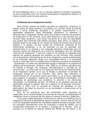 Este documento discute la política de integración escolar en Chile y los desafíos de su implementación efectiva. Propone que la integración escolar, a pesar de implicar riesgos, no constituye un costo extraordinario para las escuelas efectivas. Analiza los factores de efectividad escolar y las condiciones necesarias para una inclusión adecuada, concluyendo que efectividad e inclusión son programas complementarios. Una escuela efectiva puede asumir la integración como cualquier otra innovación educativa y responder con eficacia a la diversidad