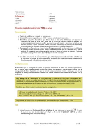 Este documento proporciona instrucciones para conectar un ordenador con Linux a Internet a través de un módem/router ADSL. Explica los componentes necesarios como una tarjeta de red, línea telefónica ADSL, microfiltros y datos de cuenta. Luego guía al usuario a través de la configuración de la tarjeta de red en Linux, ya sea mediante la utilidad netcardconfig en KDE/Gnome o mediante la configuración manual de la IP, máscara de red, puerta de enlace y servidores DNS. Una vez configurada