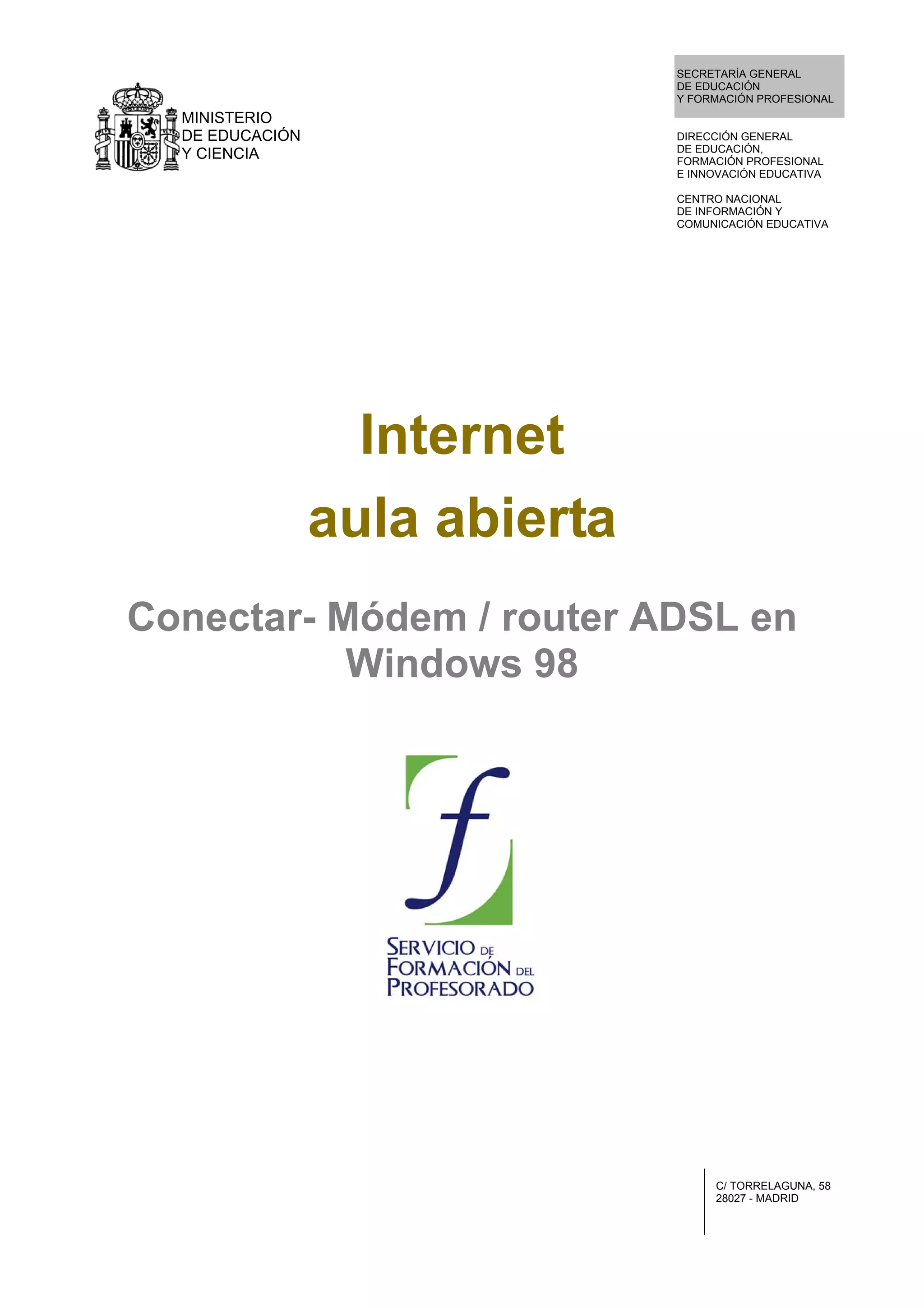Este documento explica cómo configurar una conexión a Internet a través de un módem/router ADSL en Windows 98. Primero se necesita una tarjeta de red Ethernet, una línea telefónica ADSL activa y microfiltros. Luego, se configura la tarjeta de red con una dirección IP privada dentro del rango de la red, la máscara de subred y los servidores DNS provistos. Finalmente, se establece la puerta de enlace con la dirección IP privada del módem/router.