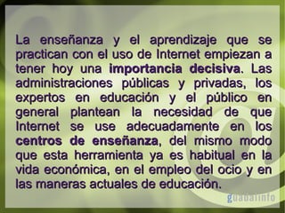 Internet está adquiriendo una importancia decisiva en la enseñanza y el aprendizaje. Aunque algunos dudan de su necesidad, se intuye que será una herramienta habitual en el futuro. Internet plantea nuevos retos para la educación al involucrar al alumno de forma activa y permitir el aprendizaje individualizado, aunque también puede distraer. El uso de Internet requiere equipamiento, software y habilidades informáticas y de investigación por parte de alumnos y profesores.