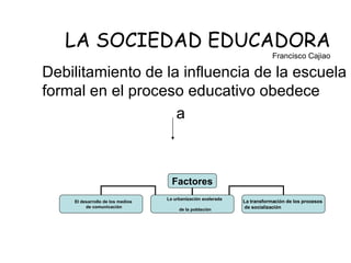 El documento discute cómo la influencia de la escuela formal en el proceso educativo se ha debilitado debido al desarrollo de los medios de comunicación, la urbanización acelerada y los cambios en los procesos de socialización. Los estudiantes ahora tienen fácil acceso a información y rechazan el discurso moralizador de los maestros. Además, otras instituciones como el sector productivo y los medios de comunicación ejercen una gran influencia en la educación y socialización de los niños y jóvenes. Por lo tanto, la respons