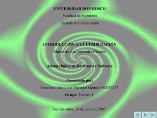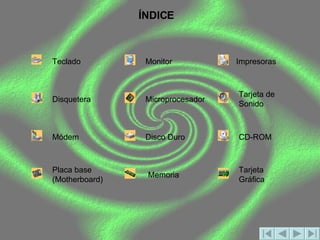 Este documento presenta resúmenes breves de varios componentes hardware y software comunes de una computadora, incluyendo el teclado, monitor, impresora, disquetera, microprocesador, disco duro, CD-ROM, placa base, memoria RAM, tarjeta de sonido, módem y tarjeta gráfica. Explica sus funciones básicas y algunas especificaciones técnicas clave.