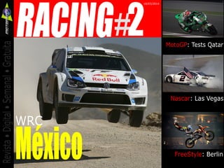 El documento presenta un resumen del rally de México del WRC 2014, donde Sébastien Ogier, de VW, se impuso y se convirtió en líder de la clasificación general. También cubre pruebas de MotoGP en Qatar, destacando a Aleix Espargaró y su rápido desempeño, así como otros temas como la participación de Dani Sordo con Hyundai y las victorias de Brad Keselowski en NASCAR. Además, se menciona el reto de Félix Baumgartner de competir en las 24 horas de Nürburgring con un Audi R8 LMS.