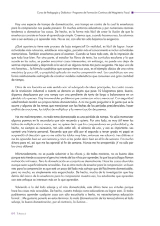 El documento habla sobre la enseñanza para la comprensión y la diferencia entre lo salvaje y lo domesticado en la educación. Explica que la educación tradicional tiende a "domesticar" los temas haciéndolos más simples y memorísticos, lo que reduce la exigencia y desmotiva a los estudiantes. La enseñanza para la comprensión mantiene los temas más del lado "salvaje", haciéndolos más desafiantes y atractivos. También destaca la importancia de enseñar no solo conocimientos