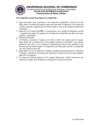 Este documento proporciona instrucciones en 3 pasos para compartir una impresora conectada a un equipo en la red: 1) Activar el compartir de impresoras en el Centro de redes y recursos compartidos, 2) Abrir la carpeta Dispositivos e impresoras y seleccionar la opción Compartir en las propiedades de la impresora, 3) Los otros usuarios pueden acceder a la impresora compartida escribiendo la ruta de red al equipo en el explorador.