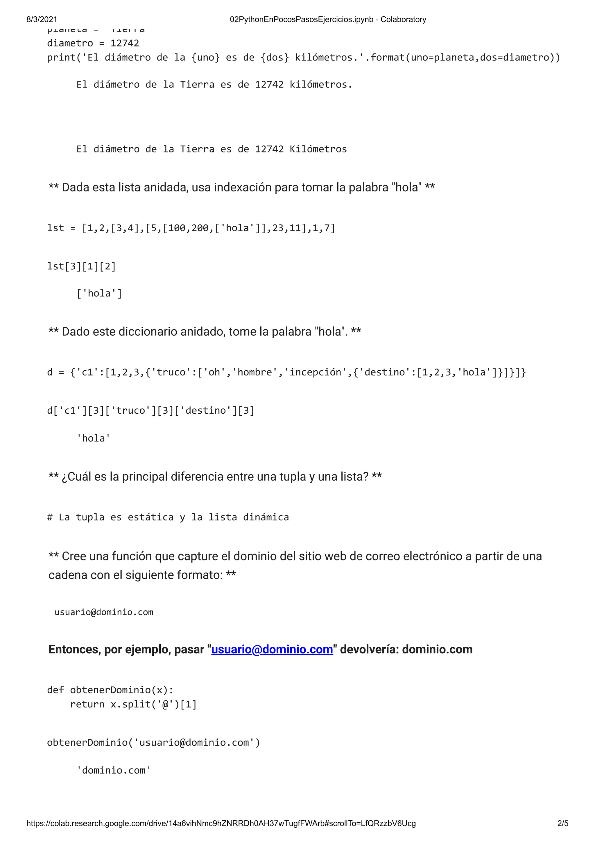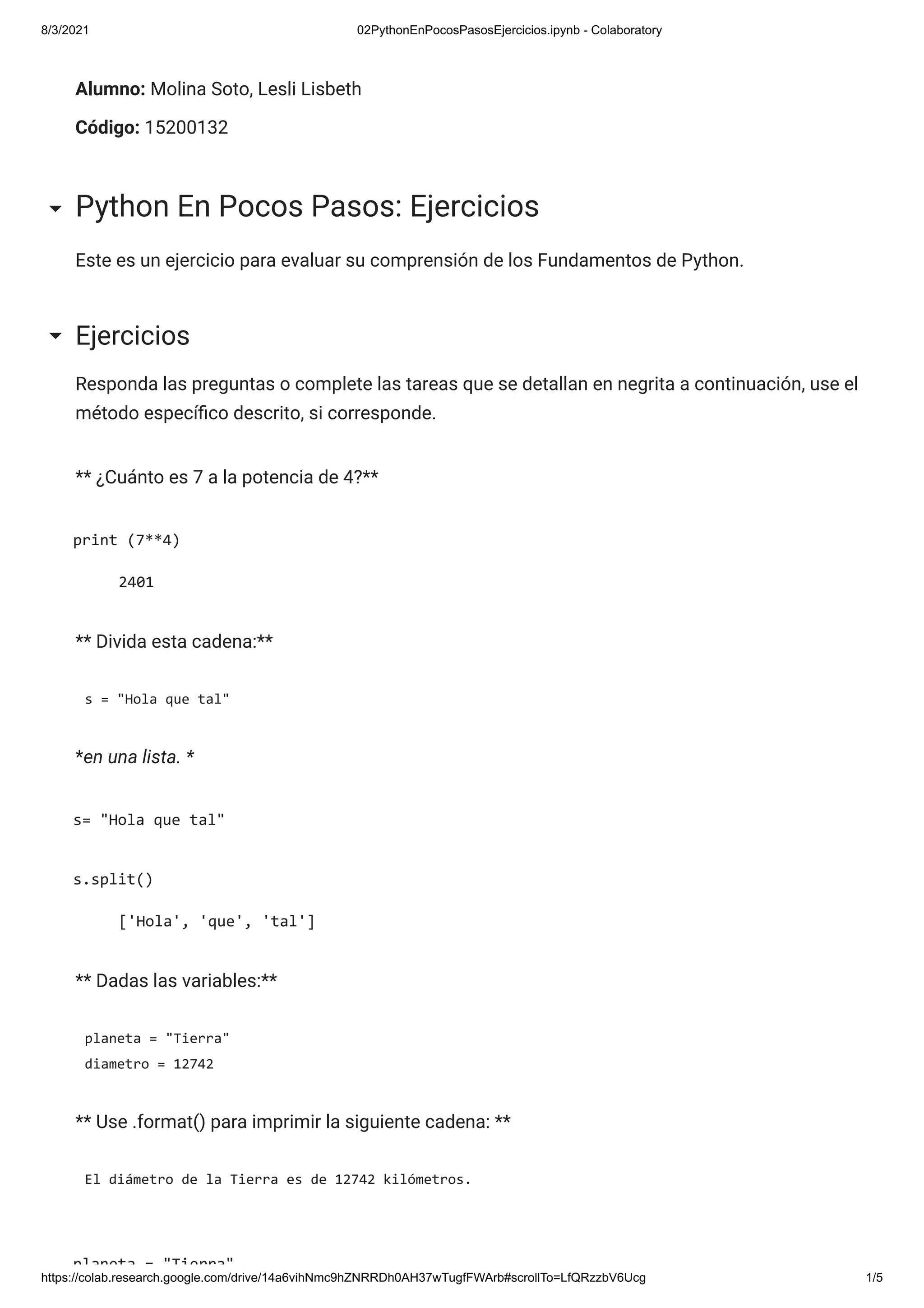 Este documento presenta una serie de ejercicios de programación en Python para evaluar la comprensión de los fundamentos del lenguaje. Los ejercicios incluyen cálculos, manipulación de cadenas, listas, diccionarios, funciones y más. Se pide al estudiante que complete cada tarea usando los métodos especificados como imprimir resultados, dividir cadenas, acceder a elementos anidados, crear funciones y más.