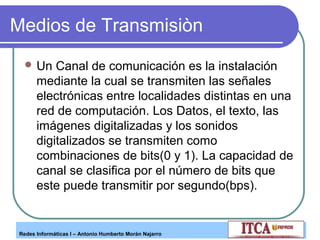 Este documento describe los diferentes tipos de medios de transmisión utilizados en redes informáticas, incluyendo medios guiados como cable coaxial, cable de par trenzado y fibra óptica, así como medios no guiados. Explica las características y aplicaciones de cada medio, y proporciona cuadros resumen comparando sus especificaciones técnicas. También describe los componentes básicos de un cableado estructurado para redes y las normas de cableado más comunes.