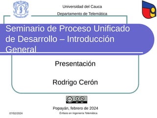 El documento describe el seminario sobre el Proceso Unificado de Desarrollo, enfatizando su origen, objetivos y características fundamentales, así como su organización temporal y por componentes. Presenta un enfoque iterativo y centrado en la arquitectura del software, abarcando desde la definición de requisitos hasta la implementación y pruebas. Se detalla también la fase de definición, incluyendo la recopilación de requisitos y la importancia de documentación y evaluación en el proceso de desarrollo.