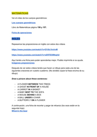 Este documento presenta las tareas escolares para los días 20 al 22 de abril. Incluye tareas de lengua, matemáticas, inglés, valores y religión. Se recuerda que el 23 de abril es el Día de Aragón y el Día del Libro, y se anima a celebrarlo leyendo o jugando juegos tradicionales aragoneses. También se invita a visitar el blog de música para ver y compartir videos musicales.