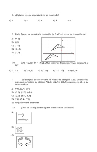 Este resumen describe una prueba de matemáticas sobre transformaciones isométricas para estudiantes de primer año de enseñanza media. La prueba contiene 12 preguntas de selección múltiple sobre temas como ejes de simetría, tipos de transformaciones isométricas como traslación, rotación y reflexión, y cálculos geométricos relacionados con traslaciones de figuras en un plano cartesiano.