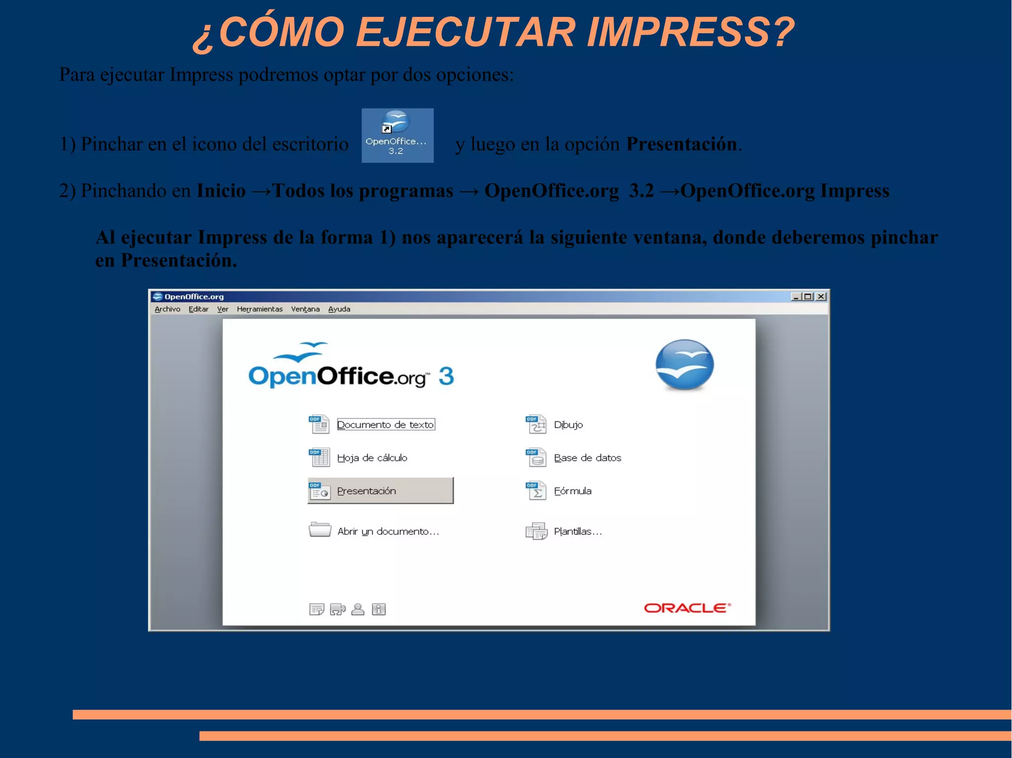 Este documento proporciona instrucciones sobre cómo usar el programa Impress de OpenOffice para crear presentaciones. Explica cómo ejecutar Impress, usar el asistente para crear una presentación modelo, agregar y modificar diapositivas, y trabajar con texto, imágenes e hipervínculos. También cubre cómo cambiar entre diferentes vistas y corregir errores ortográficos. Contiene varias actividades prácticas para que el usuario aprenda a utilizar las funciones básicas de Impress.