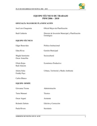 Este documento presenta el Plan de Desarrollo Municipal 2006-2010 de El Alto, Bolivia. Incluye información sobre el marco jurídico, histórico y estratégico del municipio, así como detalles sobre la visión de desarrollo, estrategias por área e índice. El objetivo general del plan es mejorar la calidad de vida de los habitantes de El Alto a través del desarrollo político, económico, sociocultural, urbano y de la gestión municipal en los próximos 5 años.