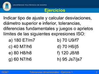 Este documento presenta un ejercicio sobre tolerancias dimensionales. Consiste en indicar el tipo de ajuste y calcular desviaciones, diámetros superior e inferior, tolerancias y juegos o aprietos límites para ocho expresiones de tolerancias dimensionales ISO que se enumeran.