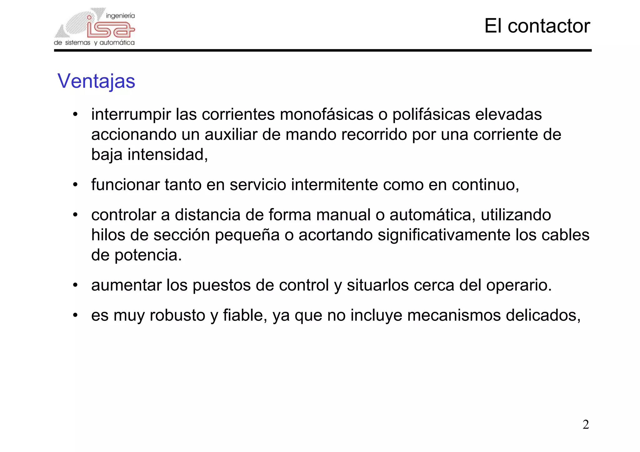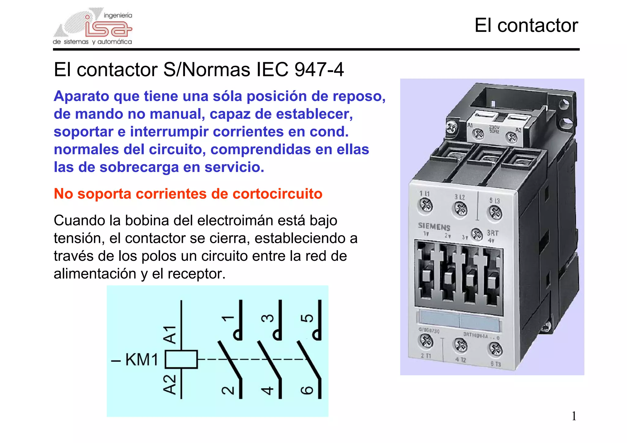 El documento describe los componentes y funciones de un contactor eléctrico. Un contactor es un dispositivo que puede establecer o interrumpir corriente eléctrica de forma remota mediante una señal de baja tensión. Incluye polos que conectan y desconectan el circuito principal y contactos auxiliares para funciones como señalización y protección. El documento también explica los posibles daños a los contactores y cómo prevenirlos.