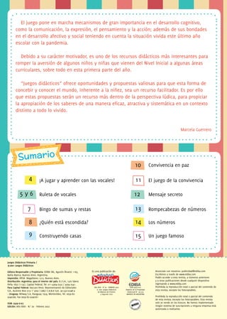 Este documento presenta varios juegos didácticos para trabajar diferentes contenidos en el aula de primaria. Incluye juegos para trabajar las vocales, sumas y restas, números, y la convivencia. Cada juego incluye una breve explicación de sus objetivos, reglas e instrucciones. El documento busca ofrecer propuestas lúdicas que faciliten la enseñanza de contenidos de manera atractiva.