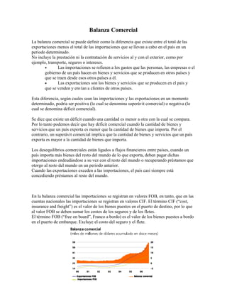 La balanza comercial es la diferencia entre las exportaciones e importaciones de un país en un período determinado. Puede ser positiva (superávit comercial) si las exportaciones superan a las importaciones, o negativa (déficit comercial) si las importaciones son mayores. Chile exporta principalmente recursos naturales como cobre, productos agrícolas y pesqueros. Sus principales socios comerciales son EE.UU., Japón, China y Corea del Sur. La balanza de pagos registra todas las transacciones financieras de un país con el exterior, incluyendo comerc