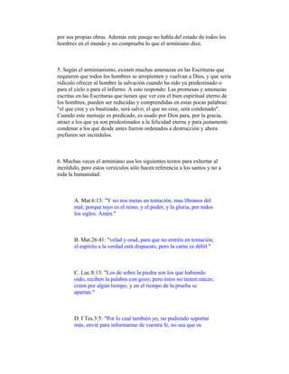 El documento discute si Dios somete al hombre a una prueba para determinar si va al cielo o al infierno. Argumenta que las Escrituras no enseñan esto, sino que muestran que la salvación es por gracia a través de la fe, no por obras. La prueba de Dios al pueblo de Israel en el desierto fue para probar su obediencia, no para determinar su salvación eterna. La idea de que todos están en un estado de prueba contradice la predestinación y elección de Dios.