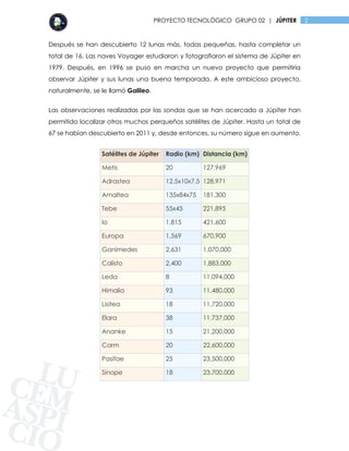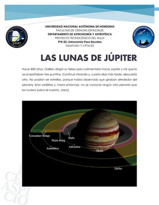 Galileo descubrió las 4 lunas más grandes de Júpiter - Io, Europa, Ganímedes y Calisto - en 1610. Desde entonces se han descubierto más de 67 lunas. Ganímedes es la luna más grande del sistema solar, mientras que Calisto tiene más cráteres. Io es volcánicamente activa debido a su órbita, Europa probablemente tiene un océano subterráneo, y las 4 lunas originales se conocen colectivamente como las lunas galileanas.