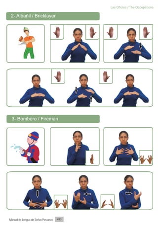 El documento lista 29 oficios comunes y proporciona la seña para cada uno. Incluye profesiones como albañil, bombero, cocinero, chofer, carpintero, jardinero, mecánico, niñera y panadero.