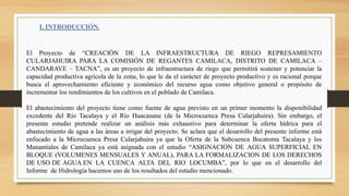 Este documento presenta el estudio hidrológico realizado para el proyecto de creación de infraestructura de riego en Camilaca, Tacna. Describe el área de estudio, incluyendo su ubicación, fisiografía, fuentes de agua e infraestructura existente. Luego, analiza la información hidrometeorológica disponible y realiza el tratamiento de datos pluviométricos para determinar parámetros hidrológicos como caudales medios y máximos en la zona. El objetivo es evaluar el potencial h
