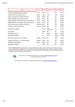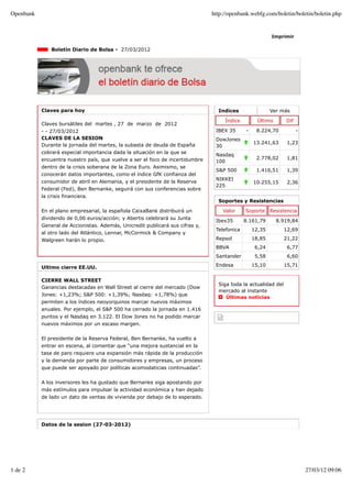 El documento resume las claves de la sesión bursátil del 27 de marzo de 2012, incluyendo datos económicos importantes que se publicarán ese día como la subasta de deuda española y la confianza del consumidor alemán. También resume el cierre alcista de Wall Street impulsado por las declaraciones del presidente de la Fed, Ben Bernanke, sobre más estímulos.