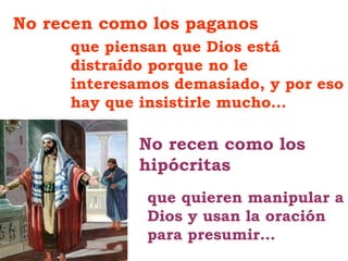 Este documento presenta las enseñanzas de Jesús sobre la oración. Jesús enseña que no debemos orar como los paganos que piensan que Dios está distraído, ni como los hipócritas que usan la oración para presumir. Además, advierte que no debemos decir las palabras de la oración del Padre Nuestro si no vivimos de acuerdo a su significado. Jesús también explica que el problema no está en Dios, sino en nosotros que somos sordos, distraídos y egoístas. Finalmente, Jesús anim