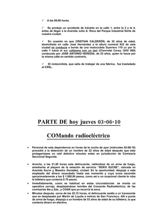 El documento resume dos accidentes de tránsito ocurridos el jueves 03 de junio de 2010 en la ciudad, en los cuales una mujer sufrió heridas leves y un joven fue trasladado a terapia intensiva. También reporta un accidente ocurrido hoy entre una motocicleta y un taxi, donde el motociclista fue llevado al hospital.