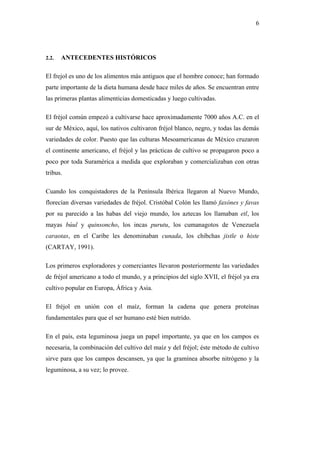 El documento provee antecedentes históricos y taxonómicos del fréjol, incluyendo su origen en México hace 7000 años, su propagación a través de América y el mundo, y su importancia nutricional. También describe variedades cultivadas en Ecuador como Canario del Chota y Paragachi, y características generales de su cultivo.