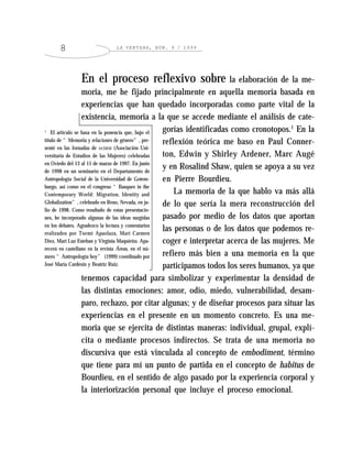 El documento discute los procesos de la memoria, en particular la memoria basada en experiencias vividas que se incorporan como parte de la existencia. Esta memoria va más allá de la mera reconstrucción del pasado y se accede a través del análisis de "cronotopos genéricos", puntos donde el tiempo y el espacio imbuidos de género convergen de manera dinámica. El autor también examina las teorías de varios pensadores como Connerton, Bourdieu y Ardener sobre la memoria incorporada versus la memoria discursiva, y