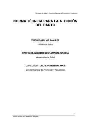 Este documento presenta la Norma Técnica para la Atención del Parto en Colombia. 1) Establece los parámetros para garantizar una atención de calidad del parto que reduzca la morbimortalidad materna y perinatal. 2) Describe los procedimientos e intervenciones requeridos durante la admisión, los períodos de dilatación, expulsión y alumbramiento. 3) Tiene el objetivo general de disminuir riesgos maternos y perinatales a través de una atención oportuna del parto.