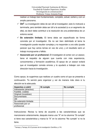 Este documento describe las características que debe cumplir un tema de investigación para ser adecuado. Las características incluyen ser interesante, factible, original, estar bien documentado, ser útil, tener un alcance limitado, y ser asesorado por un profesional. Se provee un ejemplo de cómo evaluar si un tema potencial cumple con estas características utilizando un cuadro de verificación. El documento concluye indicando que se debe elegir un nuevo tema si la mayoría de las características no son cumplidas o