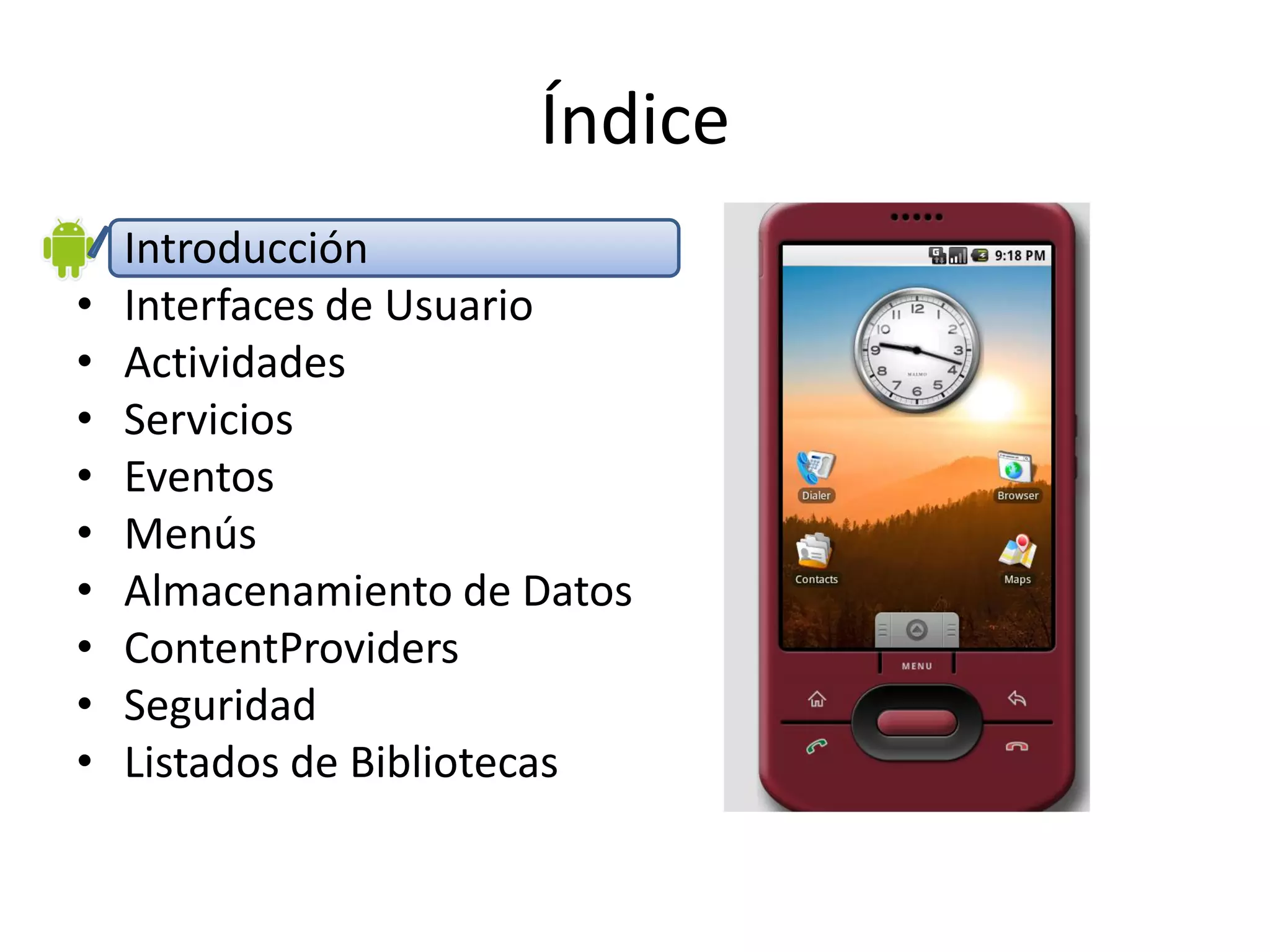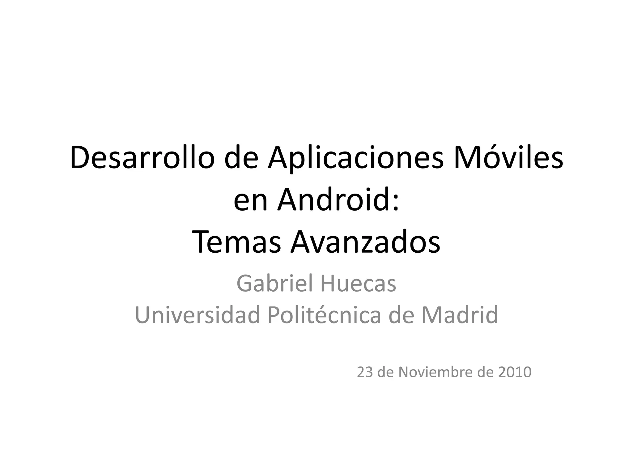 Este documento trata sobre temas avanzados del desarrollo de aplicaciones móviles en Android. Explica conceptos como interfaces de usuario, actividades, servicios, eventos, menús y almacenamiento de datos. Describe elementos visuales como views y widgets, así como gestores de layout. También cubre ciclos de vida de actividades y servicios, y el uso de intenciones, filtros de intenciones y difusión de intenciones para comunicar entre componentes.