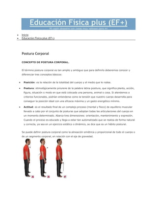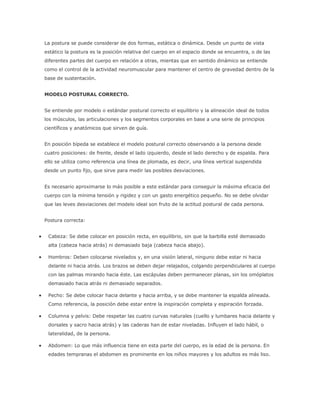 El documento describe conceptos clave relacionados con la postura corporal, incluyendo la definición de postura, el modelo postural correcto, factores que influyen en la postura, alteraciones posturales y la importancia de la educación física para una buena postura. Explica posturas correctas para estar de pie, acostado y sentado, destacando la importancia de mantener una alineación simétrica y proporcional del cuerpo.