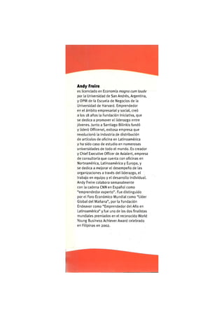 Este documento presenta la biografía de Andy Freire, un emprendedor argentino que fundó varias organizaciones exitosas. Se destaca que Freire se graduó con honores en Economía de la Universidad de San Andrés en Argentina y completó un programa de la Escuela de Negocios de Harvard. A los 18 años fundó la Fundación Iniciativa para promover el liderazgo entre los jóvenes. Más tarde cofundó Officenet, una empresa pionera en la distribución de artículos de oficina en Latinoamérica. Actualmente es el director ejec