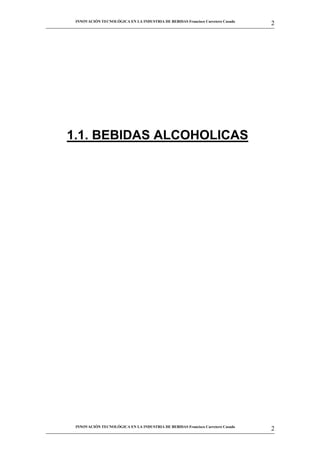 El documento describe los procesos de fabricación de bebidas alcohólicas. Explica que la fermentación alcohólica ocurre de forma natural debido a la acción de las levaduras. Detalla los tipos principales de levaduras involucradas como Saccharomyces cerevisiae y sus roles. Además, explica los procesos químicos que ocurren durante la fermentación alcohólica, incluyendo la conversión de azúcares en etanol y la producción de subproductos como la glicerina.