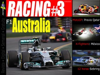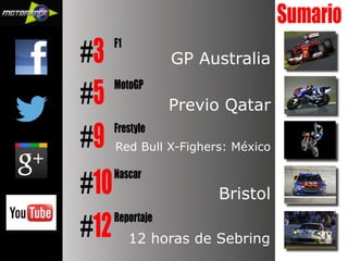 Este documento resume los resultados de varias carreras de motos, automovilismo y motociclismo que tuvieron lugar recientemente. Nico Rosberg ganó el Gran Premio de Australia de Fórmula 1, mientras que en MotoGP se acerca la primera carrera de la temporada en Qatar. En freestyle, Levi Sherwood ganó la prueba de Red Bull X-Fighters en México. Carl Edwards ganó la carrera de Nascar en Bristol.