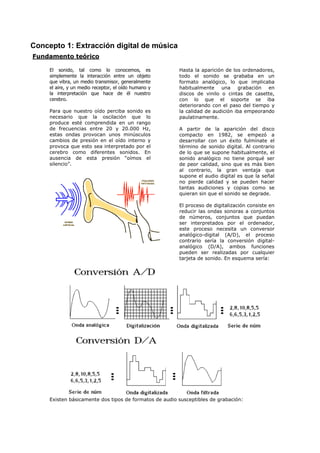 Este documento describe los conceptos básicos de la extracción y grabación digital de sonido. Explica que el sonido analógico se convierte a números digitales mediante un conversor analógico-digital, y que esto permite copiar y reproducir el sonido sin pérdida de calidad. Luego detalla dos procedimientos: 1) la extracción de música de un CD a formato WAV usando un programa, y 2) la grabación de voz usando el micrófono y el programa Audacity. Finalmente menciona otros formatos digitales de audio como MP3, Ogg,