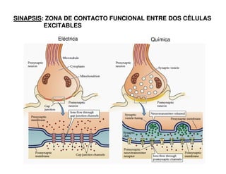 El documento describe la neurotransmisión en las sinapsis, explicando los procesos eléctricos y químicos involucrados en la comunicación entre neuronas. Se detallan las etapas de la liberación y recaptación de neurotransmisores, así como los diferentes tipos de neurotransmisores. Además, se menciona la plasticidad sináptica como un mecanismo fundamental para el aprendizaje y la memoria.