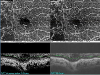 El documento resume los nuevos avances en angiografía de dominio óptico de coerencia tomográfico (OCT-Angiografía), una técnica no invasiva que permite visualizar la microcirculación retinal sin usar contraste. Explica que usa técnicas avanzadas de procesamiento de imágenes para aislar la microcirculación a partir de imágenes de OCT mediante el análisis de decorrelación. Finalmente, destaca algunas de sus aplicaciones clínicas actuales como la evaluación de neovasos en degeneración macular y retinop