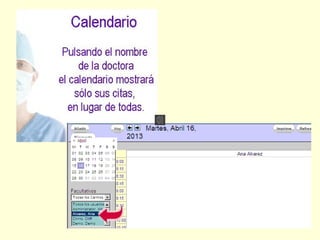 Este documento describe las funciones del calendario y la programación de citas en Open-EMR. Permite a los recepcionistas ver el calendario de todos los proveedores o de uno solo, e ingresar nuevas citas seleccionando el día y hora disponibles. Los proveedores pueden programar sus horarios de atención y disponibilidad. Las citas se crean seleccionando un paciente, fecha, hora y proveedor, y pueden cambiarse a diferentes estados como "llegado".