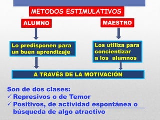 Este documento describe diferentes métodos estimulativos que pueden ser utilizados por maestros y alumnos, incluyendo juegos didácticos, creativos y profesionales. Estos métodos motivan a los estudiantes, desarrollan su pensamiento y les permiten participar activamente en clase para lograr un aprendizaje más profundo y agradable. Algunos ejemplos mencionados son la mesa redonda, el panel, la discusión y los juegos de simulación.