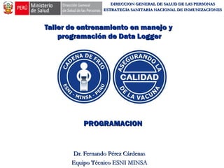 Este documento proporciona instrucciones para programar y obtener datos de los data loggers utilizados por la Estrategia Sanitaria Nacional de Inmunizaciones del Ministerio de Salud del Perú para monitorear la cadena de frío de las vacunas. Explica cómo programar los intervalos de registro, opciones de inicio y parada, y alarmas en el software Tinytag Explorer y cómo descargar los datos registrados por los data loggers para su análisis e interpretación.