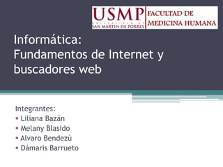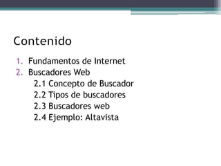 Este documento habla sobre los fundamentos de Internet y los buscadores web. Explica que un buscador web es una página que ofrece consultar una base de datos con direcciones y contenido de páginas web, originándose en 1994 con Yahoo. Luego describe los tipos de buscadores como índices de búsqueda, motores de búsqueda y metabuscadores. Finalmente, da un ejemplo de cómo funciona un buscador web típico.