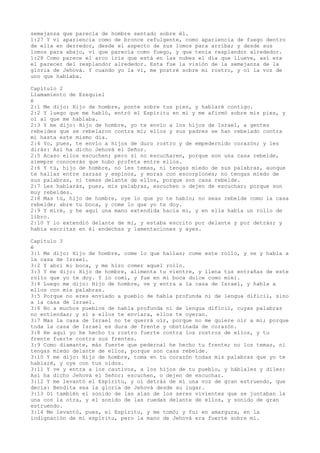 Este capítulo describe la visión que Ezequiel tuvo de cuatro seres vivientes con caras de hombre, león, buey y águila, rodeados por ruedas llenas de ojos. También vio una expansión sobre sus cabezas que parecía cristal, y sobre ella había un trono de piedra de zafiro con una figura sentada en él. Cuando Ezequiel vio esta visión se postró ante la gloria de Dios.