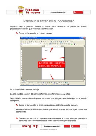 Este documento introduce las partes básicas de un procesador de texto, incluyendo la hoja de trabajo, los márgenes, el cursor y cómo escribir texto que aparece a la derecha del cursor a medida que se escribe. Aconseja prestar atención a estos elementos fundamentales y escribir dentro de los márgenes de la página.