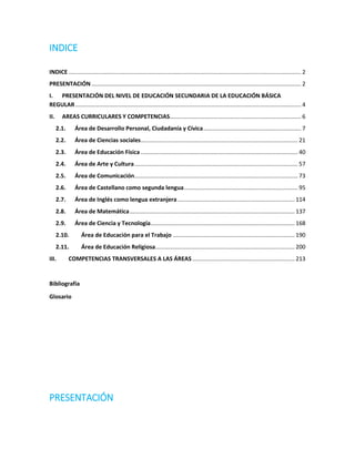El documento presenta un programa curricular para la educación secundaria que organiza competencias y áreas de aprendizaje en un enfoque integral. Se enfocan en el desarrollo personal y la ciudadanía activa, promoviendo habilidades críticas y reflexivas en los estudiantes. Además, enfatiza la importancia de considerar las transiciones y características de los adolescentes para adaptar el proceso educativo a sus necesidades.