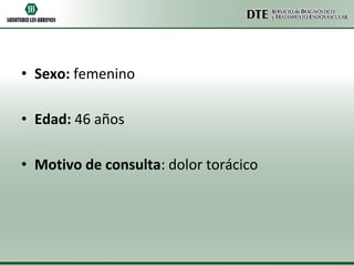 Este documento presenta el caso de una mujer de 46 años que fue derivada a un hospital por un episodio de dolor torácico. Tras realizar exámenes físicos, de laboratorio y pruebas de imagen como electrocardiograma, ecocardiograma, cinecoronariografía y gammagrafía ósea, se diagnosticó con una necrosis apical sin isquemia inducida. La paciente fue dada de alta con medicamentos como clopidogrel y rosuvastatina.