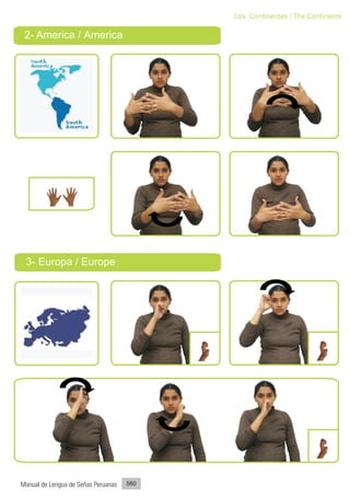 El documento presenta una lista de los seis continentes principales del mundo: 1) América, 2) Europa, 3) Asia, 4) África, 5) Oceanía y 6) Antártida. Cada continente se enumera con su nombre en español y lengua de señas peruana.