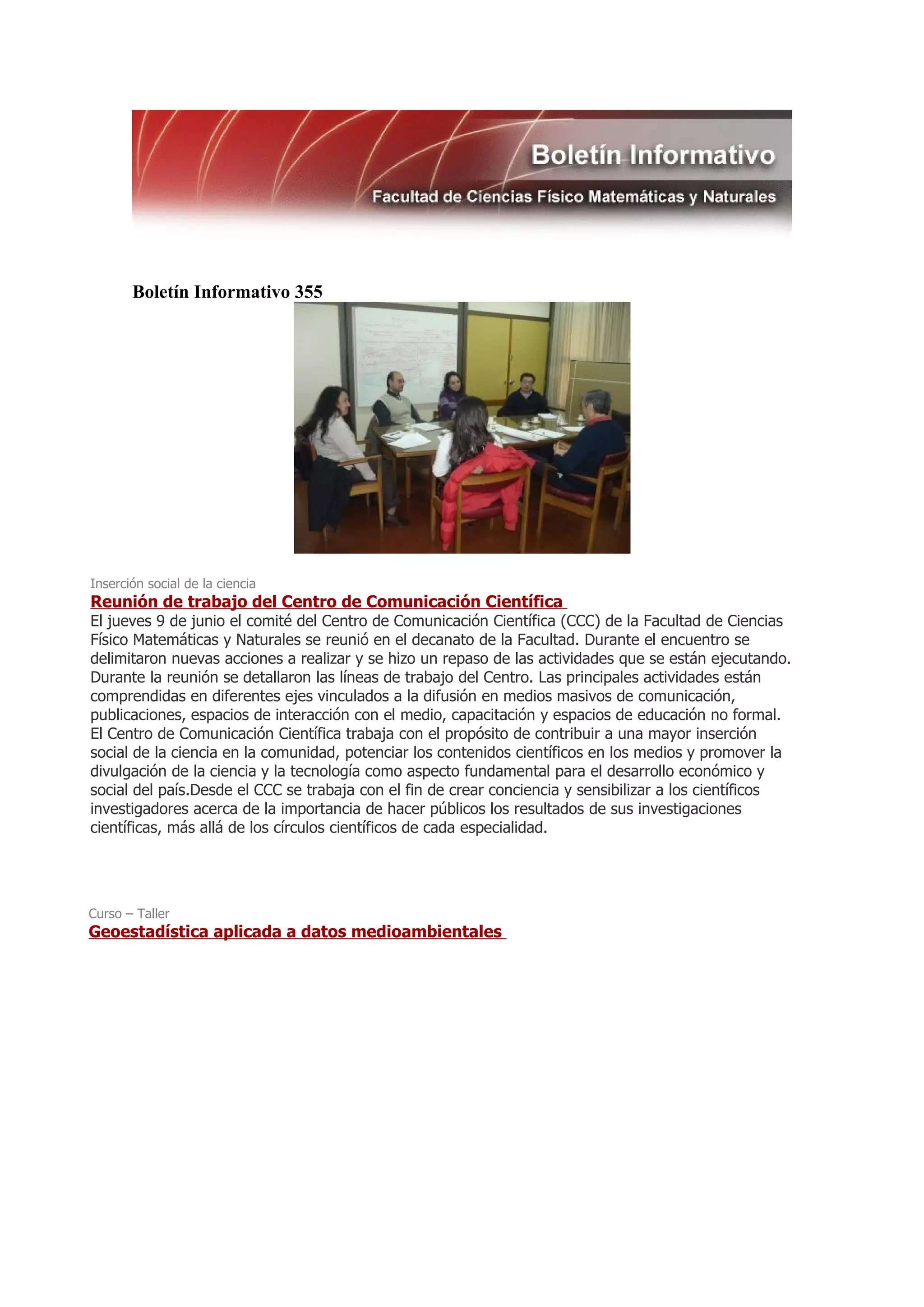 El boletín informa sobre varias reuniones y cursos recientes en la Facultad de Ciencias Físico Matemáticas y Naturales de la Universidad Nacional de San Luis. Entre ellos, una reunión del Centro de Comunicación Científica para definir nuevas acciones, un curso de geoestadística aplicada a datos medioambientales, y el lanzamiento del boletín "Docentes Conectados" por el Centro de Informática Educativa.